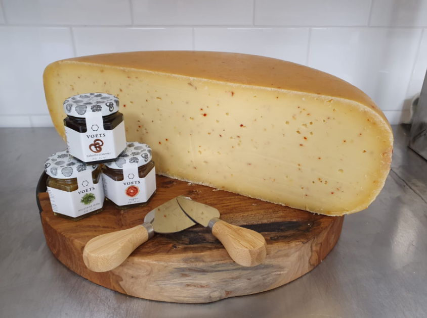 Deze ui-knoflook-paprika boerenkaas is een jonge kaas en heeft minstens 6 weken gerijpt.