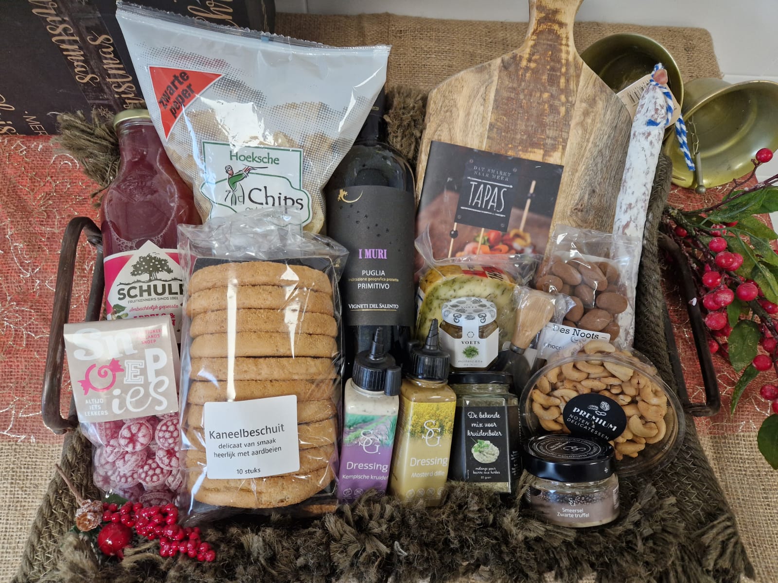 Gevuld met heerlijke kwaliteitsvolle lekkernijen en/of een prachtige borrelplank. De grootte van dit pakket biedt ruimte voor dit allemaal!